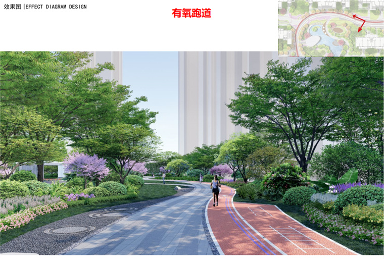 小区入口即是林荫道,用绿意盎然的景色迎接业主回家,有氧跑道为社区业主提供健康运动场所。