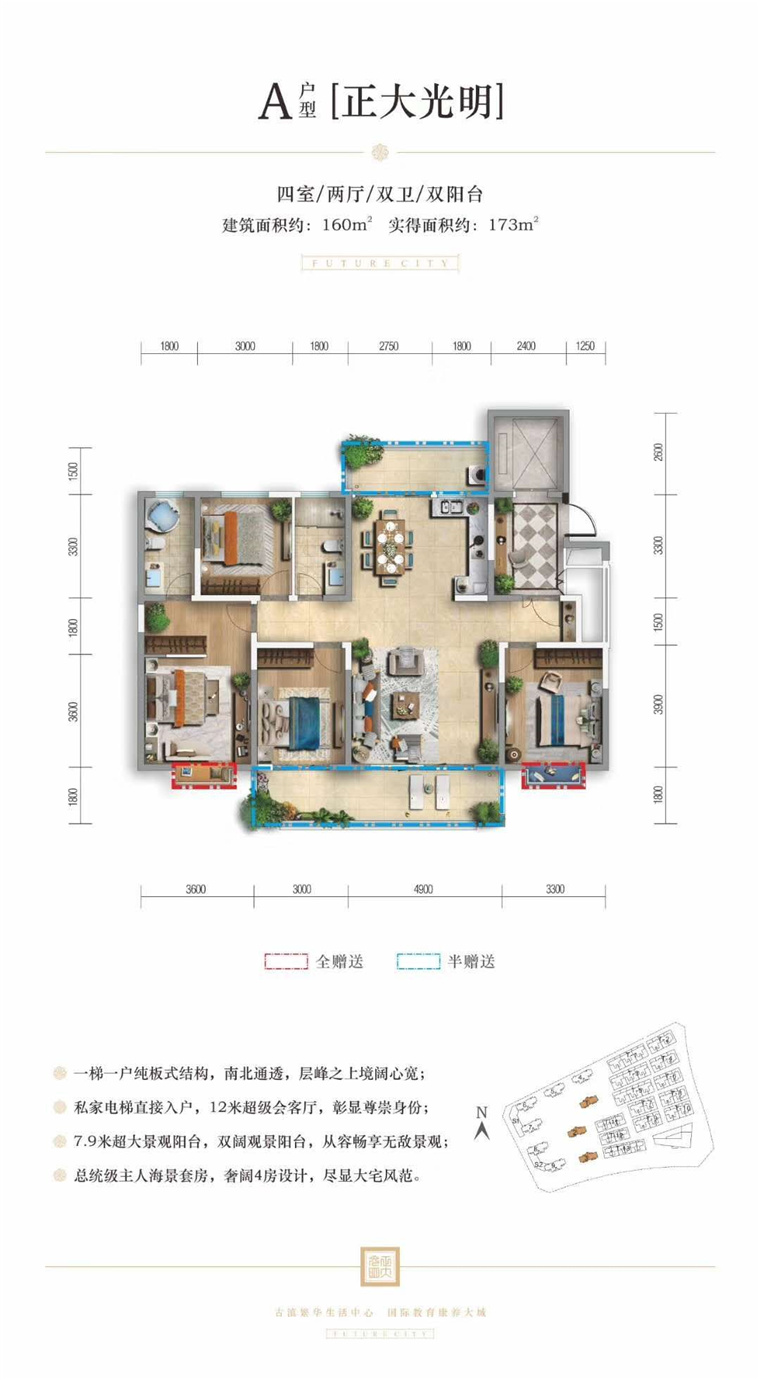 A户型:建面约160㎡,实得约173㎡,四室两厅双卫双阳台,1梯1户纯板式,私家电梯直接入户,4.9米宽景客厅,前后双阳台,尊享高品质度假生活;
