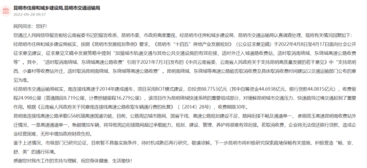 昆明市住房和城乡建设局 昆明市交通运输局回复:
