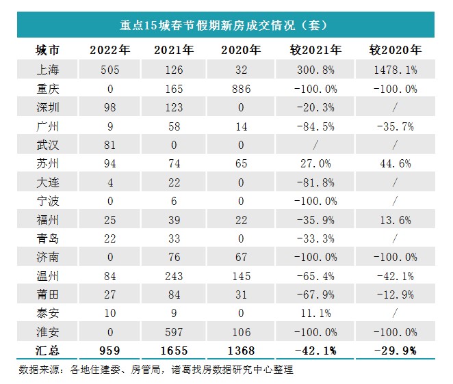 2月7日,根据诸葛找房数据研究中心公布的监测数据,2022年春节假期重点15城新房成交959套,创近五年春节成交新低,比去年春节下跌42.1%。