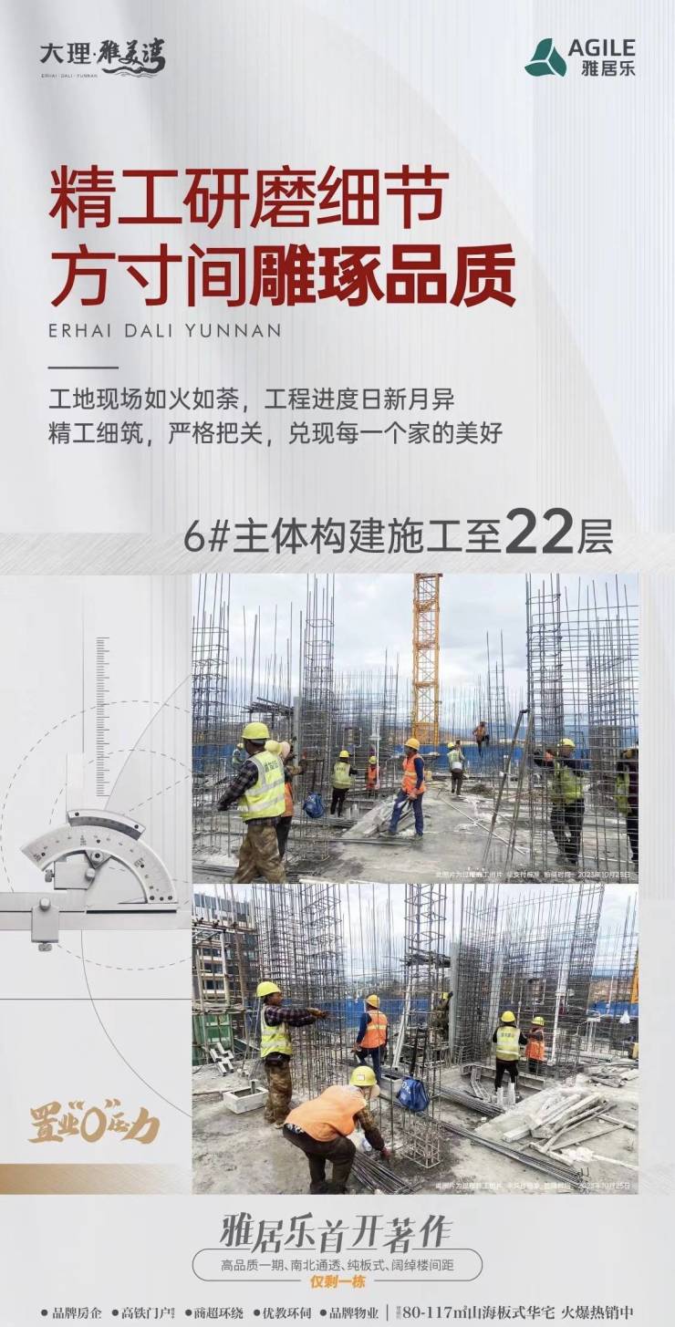 大理雅美湾,精工研磨细节,方寸间雕琢品质,现目前6#主体构建施工至22层。关注大理雅美湾的朋友可抓紧时间前往售楼处现场看房咨询,联系电话400-156-0036转385895。