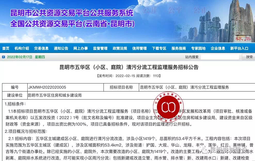 2月15日,昆明市公共资源交易中心发布《昆明市五华区(小区、庭院)清污分流工程监理服务招标公告》,本次项目实施范围为五华区主城区(建成区),涉及小区1419个,总面积约53.4平方千米。