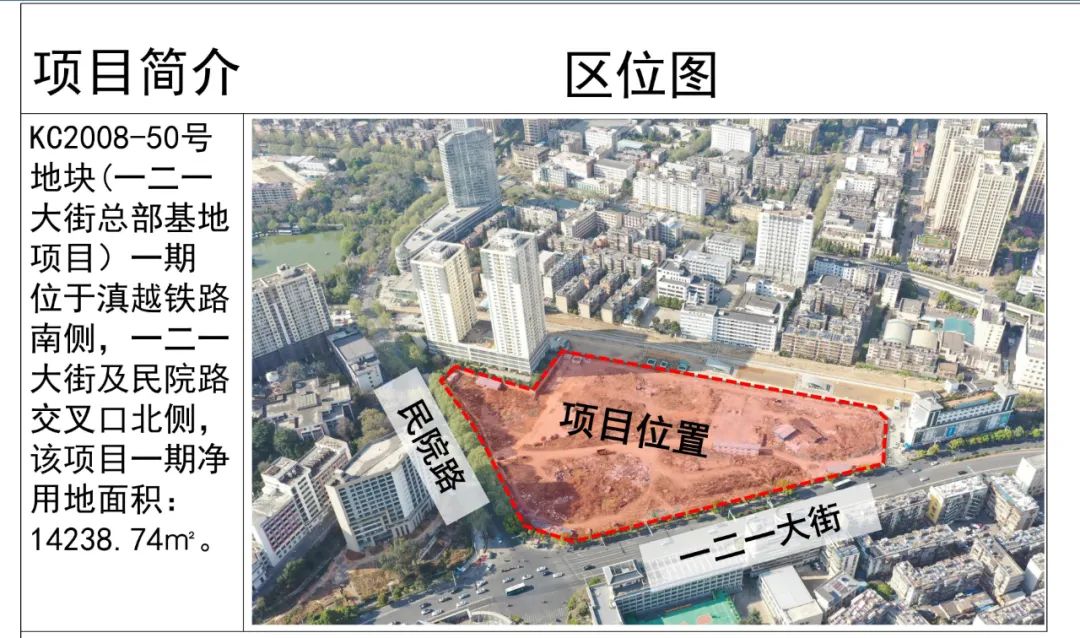 3月17日,昆明市自然资源和规划局公布了“KC2008-50号地块(一二一大街总部基地项目)一期批前公示”,项目一期总用地面积14238.74㎡,总建筑面积62682.38㎡。
