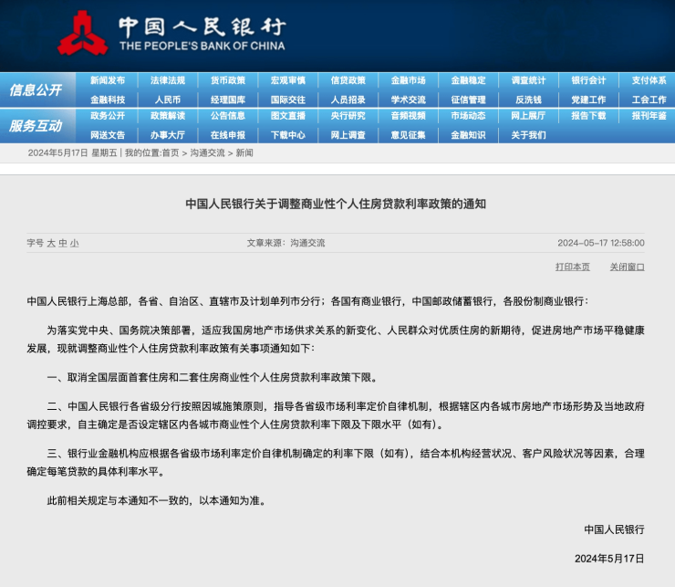 央行: 取消首套住房和二套住房商业性个人住房贷款利率政策下限