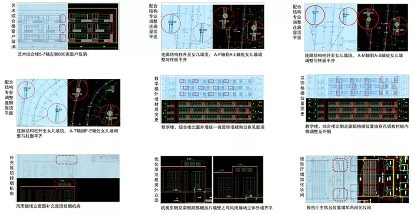 附图变更内容包含以下几类:1.窗户材质变更;2.门窗形式及数量变更;3.配合结构专业调整连廊屋顶平面;4.外墙材质变更;5.装饰格栅位置变更;6.风雨操场立面图补充屋顶排烟机房;7.报告厅主席台位置增加两间化妆间;