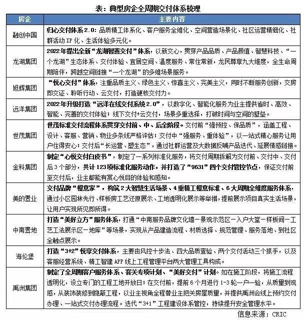 克而瑞表示,2022年,房企除了迭代更新产品,另一重点是交付和服务升级,具体围绕交付体系、社区焕新、社群营造等维度。首先,“保交付”成为房企存活的命脉,纷纷将其提升到企业调整过渡阶段的重中之重;其次,行业回归居住属性,在“保交付”的基础上,房企回归制造业,重拾工匠精神,交付成为展示房企从产品设计、成本预算、工程技法、产品质量到服务能力的重要连接端口。