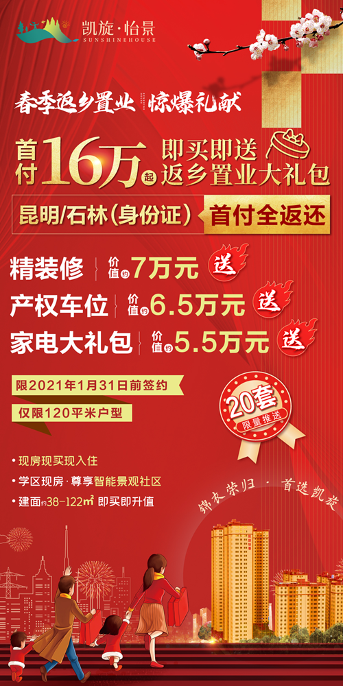 目前,正值年底,大家都在准备返乡,而石林首席生态宜居大盘-凯旋怡景,开启了“首付全返还”的返乡置业优惠活动,具体活动内容如下: