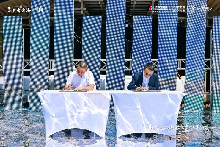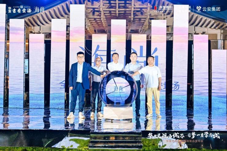 之后在主持人的引导下,华发股份与云安集团各大领导共同登台按下全息投影球,华发股份与云安集团的LOGO在海面上交互碰撞,全新【海尚】组团LOGO从海面破水而出,发出闪耀的光芒定格在大屏幕和投影球中,寓意着活动的圆满开启。【海尚】组团正式登场,开启华发书香云海全新生活方式。