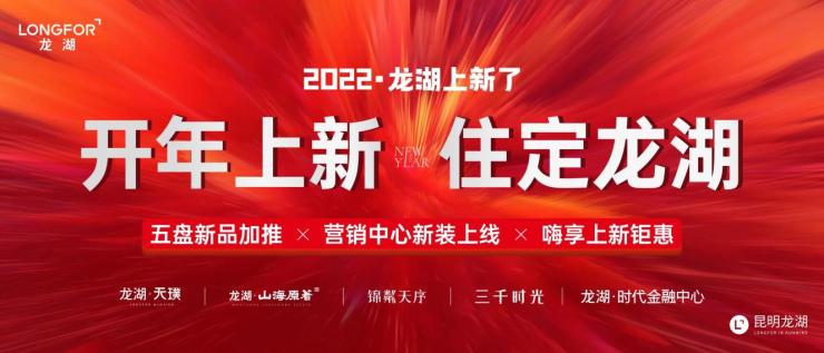 2022年,昆明龙湖“整装再发”,携龙湖·山海原著、锦粼天序、龙湖·天璞、龙湖·时代金融中心、三千时光五盘人气爆品而来,带来更新的风貌、更好的产品、更多的“金”喜!