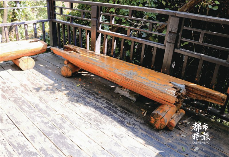 记者走访发现,园内没有任何施工痕迹,下沉广场内部依旧被围挡,围挡上面还张贴着去年的施工公告。公园假山、亭子等多个地方的木头步道已经腐坏,走在上面有明显的松动感。为了防止发生意外,弥勒寺公园物管昆明悟鸣企业管理有限公司悬挂了“木地板腐坏,请注意安全”的标语。在公园通向假山山顶的栈桥上,不仅出现木地板腐坏的情况,其中还有一侧扶手发生了小范围倒塌,公园各个角落的木头条凳也是原来的旧条凳,没有修缮过的痕迹。