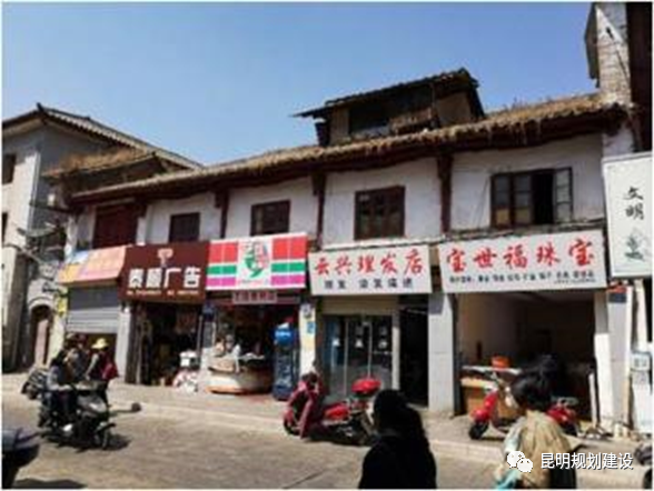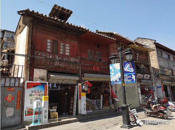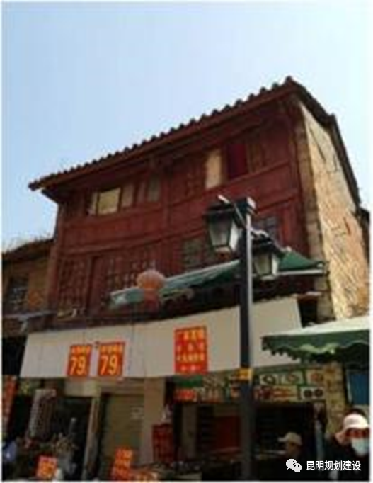 该建筑位于五华区光华街与文庙直街交叉口西侧,为两层临街一字型、五间联排布置的传统商铺建筑,下店上宅。砖木结构,硬山顶,其中三楼的阁楼独具一格。