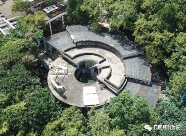 该建筑位于昆明动物园内,始建于20世纪80年代,作为热带猴繁育及展览使用。建筑平面结合地形呈扇形布置,其中内部圆形为服务用房,南侧外围扇形建筑作为动物活动用房,立面为玻璃。建筑结合地形错落有致,满足观光、后勤服务等功能。
