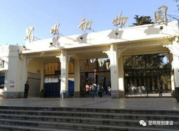 该建筑位于圆通路东段昆明动物园入口处,为苏式建筑风格大门。其平面规整,四列两行柱子形成三开间门洞,东西两侧分别设配套用房;立面呈三段式分隔,同时结合中式元素设计有挑檐枋等构件,原立面为灰白色水刷石,整体稳重而不失活力。