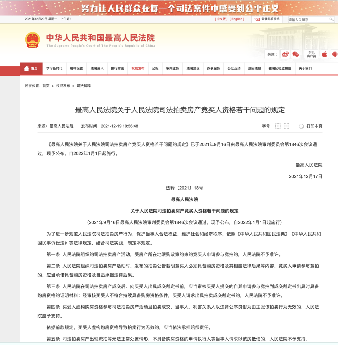较高人民法院网站19日发布《关于人民法院司法拍卖房产竞买人资格若干问题的规定》(下称《规定》),这一《规定》于今年9月份由较高人民法院审判委员会第1846次会议通过,自2022年1月1日起施行。