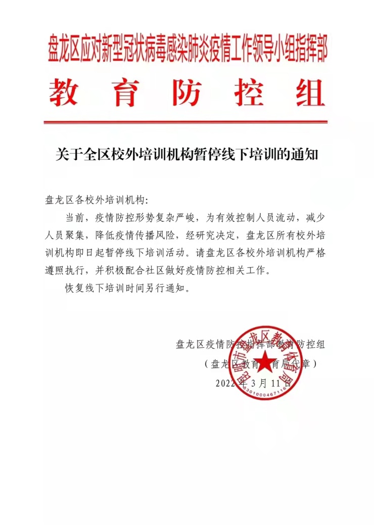 当前,疫情防控形势复杂严峻,为有效控制人员流动,减少人员聚集,降低疫情传播风险,经研究决定,盘龙区所有校外培训机构即日起暂停线下培训活动。请盘龙区各校外培训机构严格遵照执行,并积极配合社区做好疫情防控相关工作。