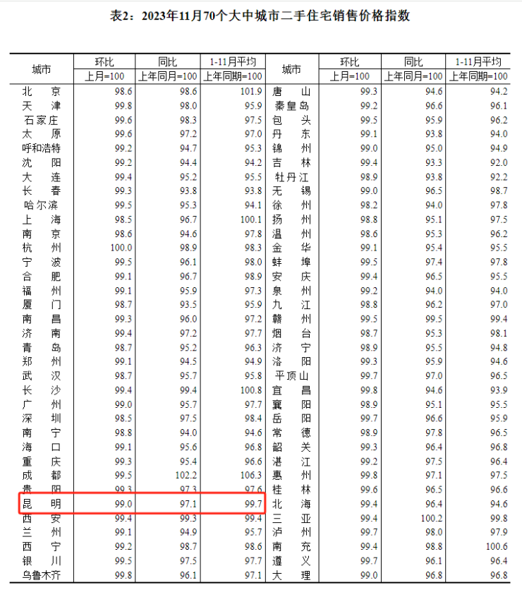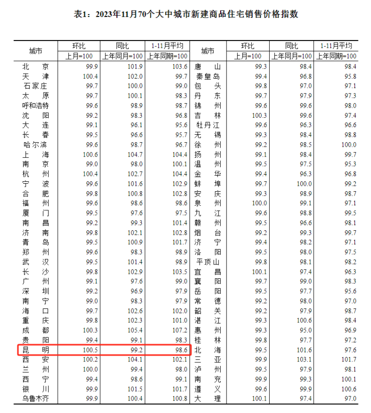 数据显示:2023年11月,昆明新房价格环比上涨0.5%、同比下跌0.8%,二手房价格环比下跌1%、同比下跌2.9%。
