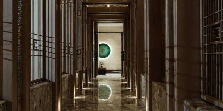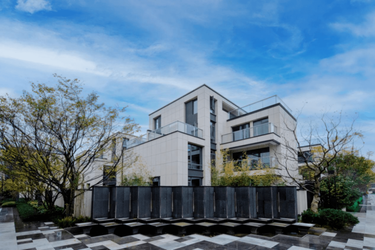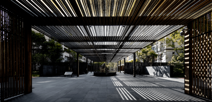 园区70%的地面和景墙采用像素化铺贴,宅间园路、入户平台、院门三者都是严格居中对缝,院门内外侧收口几乎零误差,从整体风格,到工艺细节,均是精工匠艺。