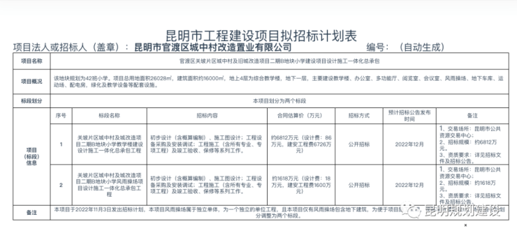 值得一提的是,11月30日云南省公共资源交易信息网亦发布《官渡区关坡片区城中村及旧城改造项目二期B地块小学建设项目设计施工一体化总承包》招标计划,该地块规划的42班小学即将动工,预计投资8400万元。