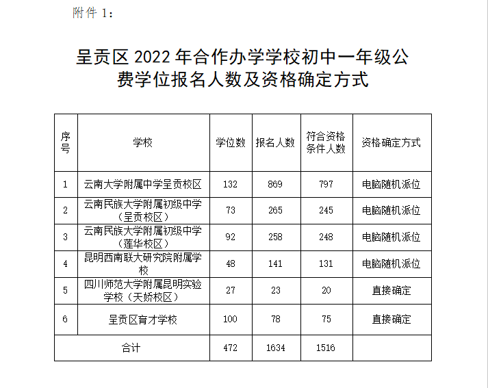 1.呈贡区2022年合作办学学校初中一年级公费学位报名人数及资格确定方式