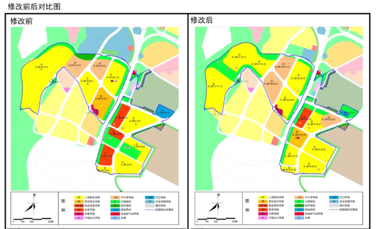 修改后,17宗用地增加为19宗,二类居住用地由7宗增加至11宗,中小学用地由2宗增至3宗,商务用地由3宗减为1宗,取消了工业用地。