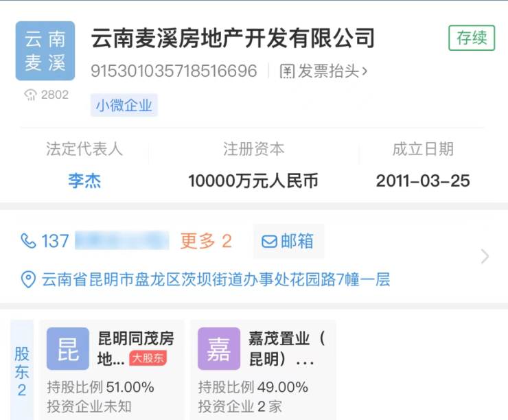 都市时报·大象房鉴所记者了解到,目前,麦溪村城改项目的社会投资人——云南麦溪房地产开发有限公司有两大股东,分别是昆明同茂房地产开发有限公司、嘉茂置业(昆明)有限公司。其中,昆明同茂房地产开发有限公司控股51%,属于万科的子公司;嘉茂置业(昆明)有限公司是同德的子公司,控股49%。