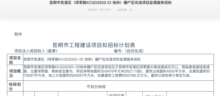 3月8日,云南省公共资源交易信息网发布《昆明市官渡区(珥季路KCGD2020-33 地块)棚户区改造项目监理服务招标公告》,根据公告,该改造项目西临南连接线高速路,北靠珥季路,南挨老宝象河。