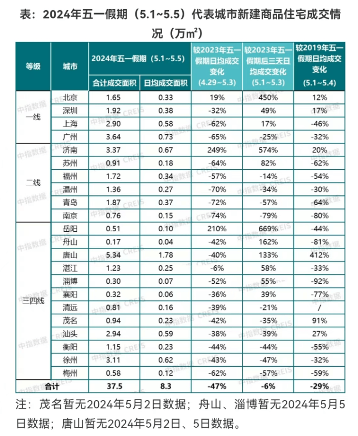 中指院数据显示,五一假期期间,部分城市在政策优化及项目促销带动下,新房项目到访量较之前有所增加。22个代表城市新房日均销售面积较2023年假期下降超四成,恢复至2019年假期水平的七成左右。