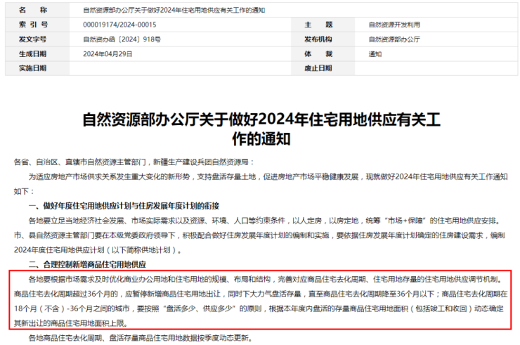 自然资源部近日发布《关于做好2024年住宅用地供应有关工作的通知》,通知提出,各地要根据市场需求及时优化商业办公用地和住宅用地的规模、布局和结构,完善对应商品住宅去化周期、住宅用地存量的住宅用地供应调节机制。商品住宅去化周期超过36个月的,应暂停新增商品住宅用地出让,同时下大力气盘活存量,直至商品住宅去化周期降至36个月以下;商品住宅去化周期在18个月(不含)-36个月之间的城市,要按照“盘活多少、供应多少”的原则,根据本年度内盘活的存量商品住宅用地面积(包括竣工和收回)动态确定其新出让的商品住宅用地面积上限。