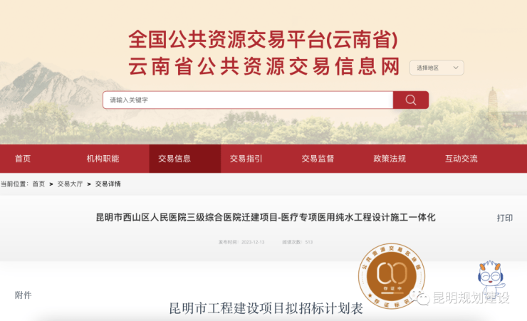 12月13日,昆明市西山区人民医院三级综合医院迁建项目在云南省公共资源交易信息网连发7条招标计划表,围绕着医疗专项智能化工程设计施工一体化、医疗专项实验室工程设计施工一体化、医疗专项医用纯水工程设计施工一体化等工程进行公开招标。