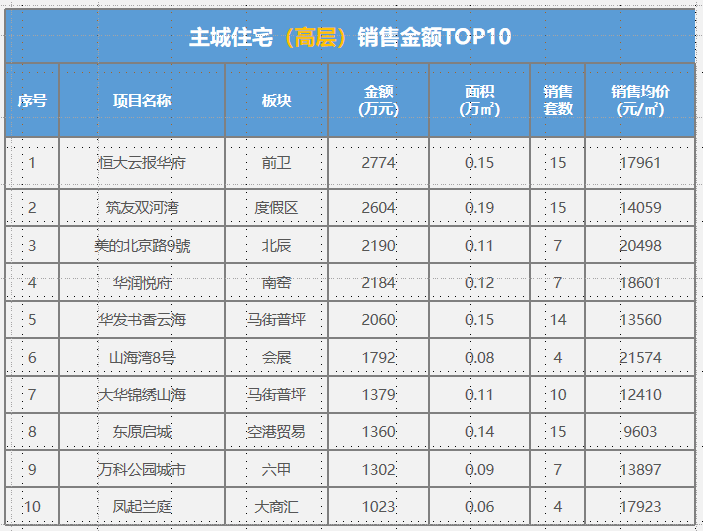 本周住宅成交均价14413元/㎡,环比持平。受主力项目恒大云报华府、华润悦府、美的北京路9號等高价项目支撑住宅均价。