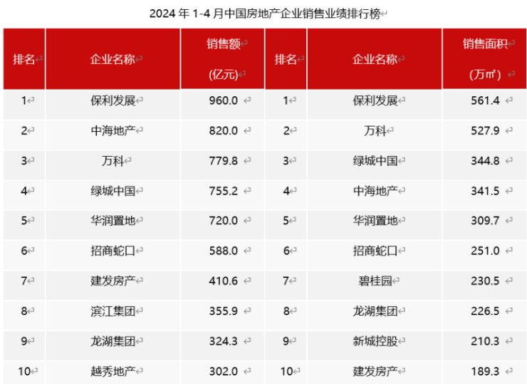 1-4月房企销售排位赛:“保海万”居前,保利榜首优势扩大
