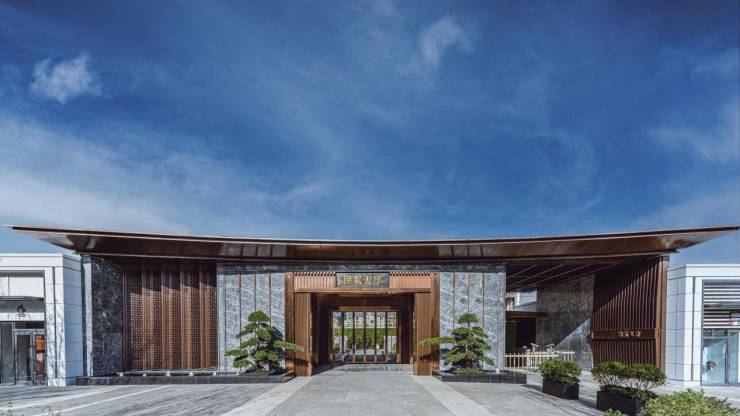 锦粼天序设置了四重归家礼序:入口前场→酒店式大门→溯水廊道→中庭水景照壁;