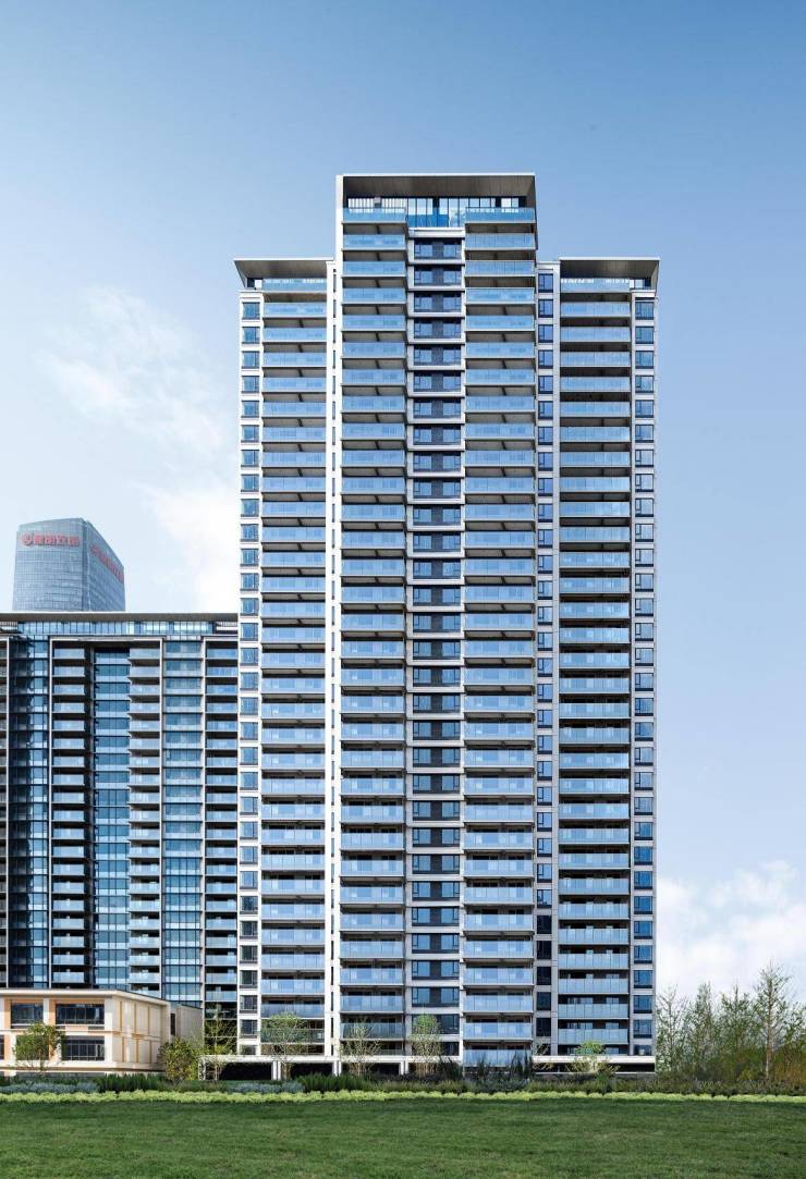 首先是外立面。龙湖豪宅产品的外立面采用的是当前国内豪宅最流行的处理方法,单体设计呈三段式、水平向,通过体块的进退,材质的分色,消解建筑的体量感,拉近人与自然的距离。