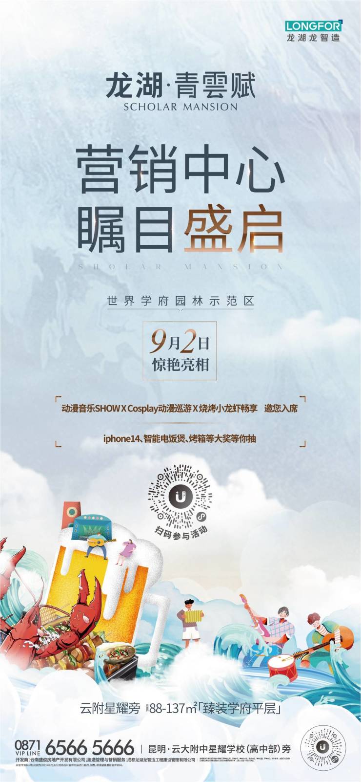 9月2日,龙湖·青雲赋售楼部将盛大开放,届时将会举办夏季动漫音乐节,邀请乐团演出儿时动漫主题曲,有孩子最爱的奥特曼、火影忍者、龙珠、猪猪侠等,并有cosplay现场人偶巡游互动。同时,莅临售楼部还能抽取惊喜神秘大奖,而且现场有小龙虾、烧烤、啤酒让您畅享!欢迎大家前来共鉴龙湖·青雲赋售楼部开放盛典!
