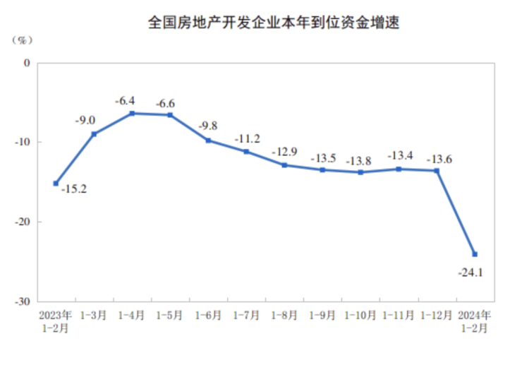 从房企端来看,今年1-2月份,房地产开发企业到位资金16193亿元,同比下降24.1%,跌幅较2023年1-12月扩大10.5个百分点。