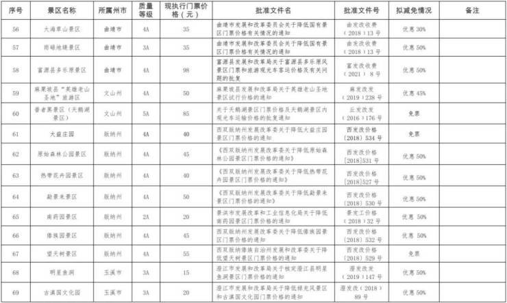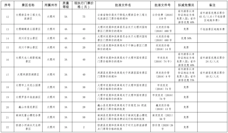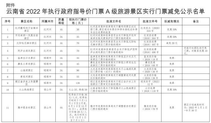 为贯彻落实《云南省人民政府办公厅印发关于精准做好疫情防控加快旅游业恢复发展若干政策措施的通知》,精准做好“鼓励执行政府指导价的A级旅游景区开展门票降价促销活动,由省财政按照减免额度给予50%补贴”工作。经各州市文化和旅游部门初审上报自愿参加门票降价促销活动执行政府指导价门票的A级旅游景区名单,省文化和旅游厅会同省发展改革委物价管理部门审核,现对实施门票减免的旅游景区名单及门票价格予以公示。公示截止日期:2022年5月20日,如有异议,请向省文化和旅游厅反映。