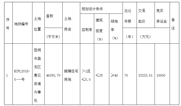 根据交易文件,该宗土地属于盘龙区虹桥村、龙池村片区城改项目三期土地。位于昆明市盘龙区青云街道办事处,地处东白沙河南面、人民东路延长线以北,土地编号为KCPL2018-5-一号。