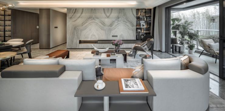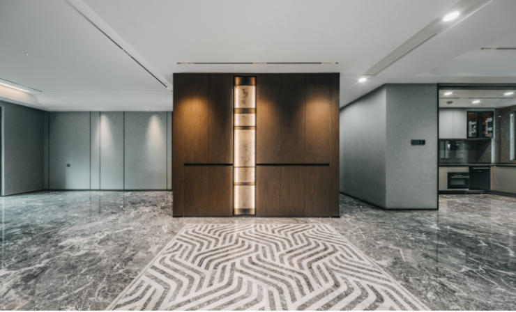 四整幅青花白天然石材铺贴,纹理氤氲多变,犹如天使之翼,又犹如大雁归巢,豪宅品质感扑面而来。