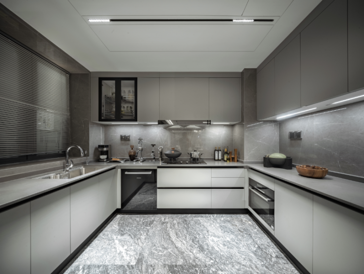 深灰内敛的青花白石材搭配洁白的石膏吊顶和浅灰色墙布,简约大气;空间无主灯设计,加上可移动线型的多头磁吸灯,内藏漫反射灯带,在3000k色温的灯光下,整个豪宅空间,层次分明,轻盈飘逸。