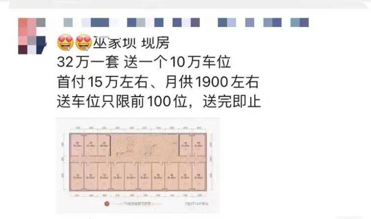 “巫家坝现房,32万元一套,首付15万元,月供1900元左右,还送价值10万元的车位1个。送车位只限前100位,送完即止!”