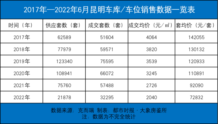 总体来看,从2017年到2022年6月,昆明主城车位供应数量达到了47万个,成交数量约34万个,库存有12万个。