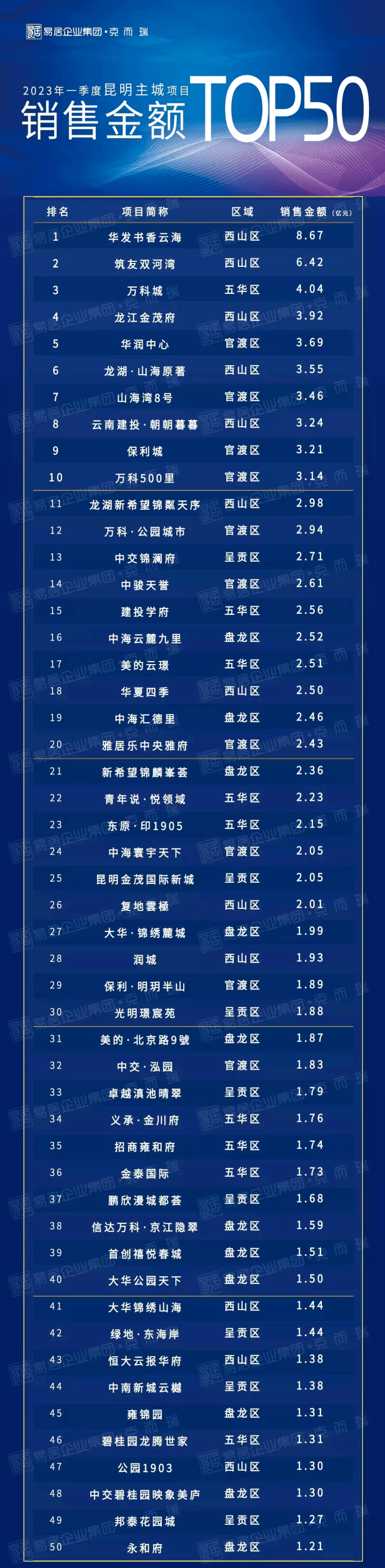 目前,昆明有多个在售的项目。4月5日,克而瑞发布了2023年一季度昆明主城项目销售金额排行榜前50名榜单,可供购房者参考。此外,都市时报·大象房鉴所还盘点了多个文旅项目: