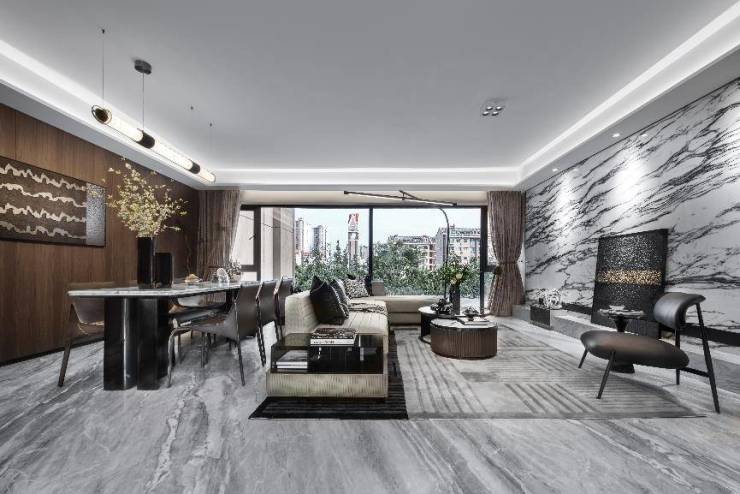 在精装设计上,锦粼天曜主张以雅为度,将多重材质之间的肌理奢雅碰撞形成统一,还做到了全屋奢配一线品牌。