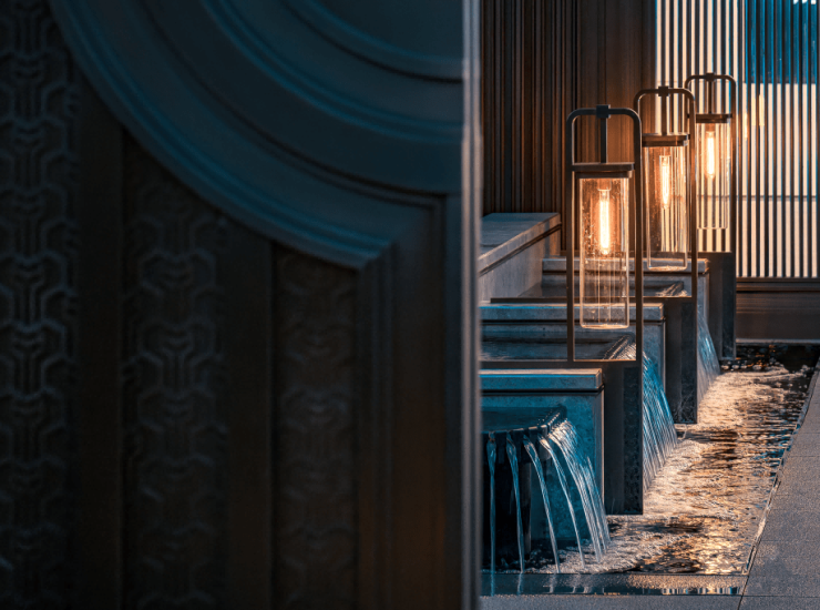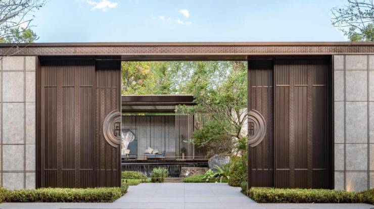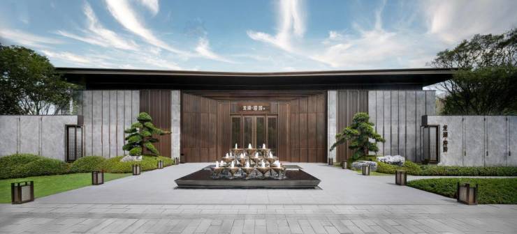 高约3.5米门庭景墙,甄选珍贵石材,高级冷灰色调搭配金属简奢线条,姿态清妍;对称美学优质契合的迎客松风雅而立;景纹宫灯辅以精琢雕刻的万象纹,匠制镶嵌于景墙中,奢华大气。