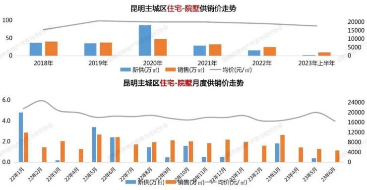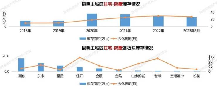截止2023年6月,昆明市主城区院墅库存53万㎡,库存持续下降;去化周期减少至28个月;主力存量项目为筑友玺珑湾、子君山麓城、美的顺城府等。