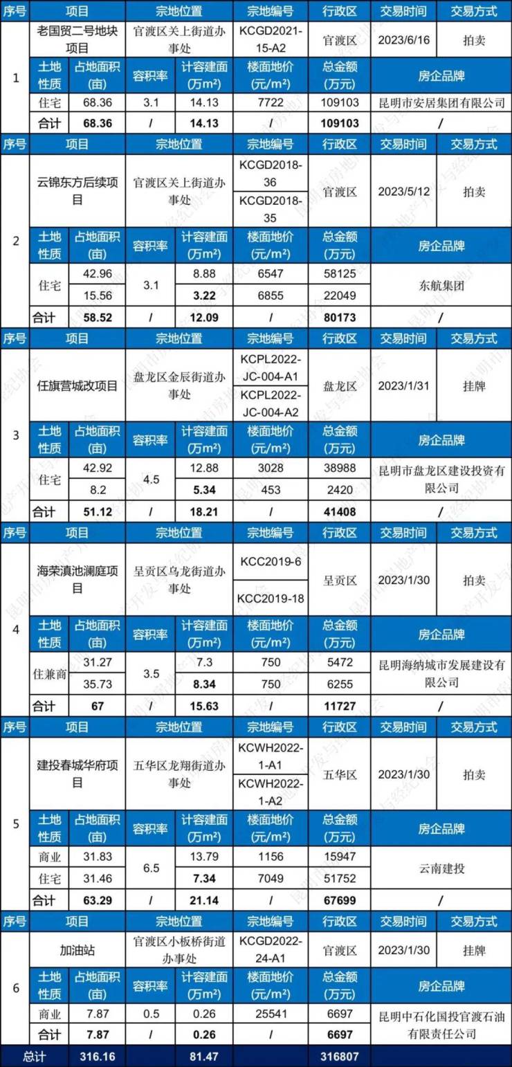 累计成交5个可完整开发项目:建投春城华府项目、海荣滇池澜庭项目、任旗营城改项目、东航云锦东方后续项目以及老国贸二号地块项目。
