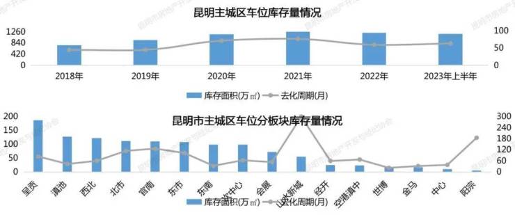 昆明市主城区车位库存量仍然处于高位量,2022车位库存量为1222万㎡,去化周期为59个月。