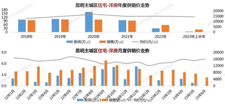 少量供货,成交下滑;呈贡区高性价比项目成交拉低整体均价;上半年月均成交1.7万㎡。