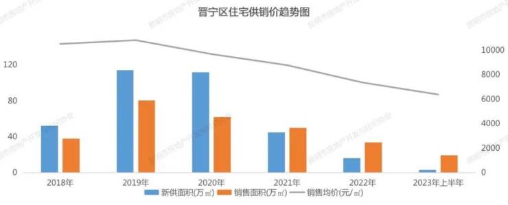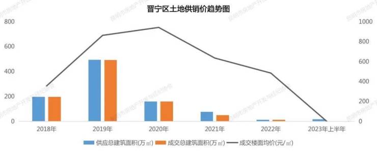 晋宁区上半年土地市场仅供应1宗土地,目前地块公示中,将于7月22日揭晓,因此无成交;整体土地市场供应量上升,供应建面17万㎡,同比上涨173%;自2021年保护滇池政策影响,总体供销持续低位运行。