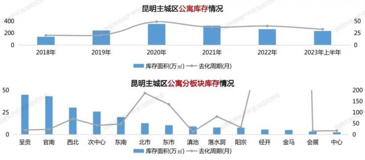 公寓存量主要集中在呈贡、官南、西北、次中心和东南板块;经开和金马板块存量小,但整体销量低,去化周期较长。